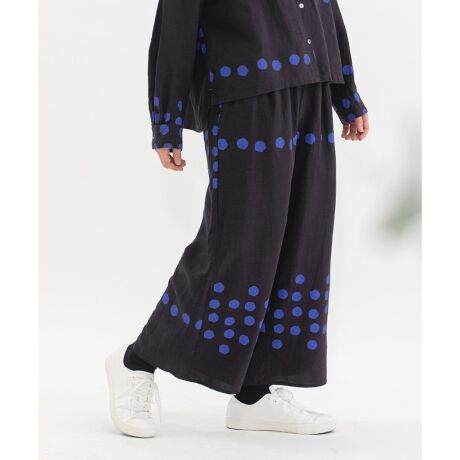 角張ったドット柄を、大きなボーダー状に並べたオリジナルパネルプリントで仕立てたパンツ。リネンの節の素材感で、カジュアルかつヴィンテージライクな軽く透け感のある生地を使用しています。フロントワンタックで広がりすぎないワイドな9分丈パンツ。ウエストはゴム仕様で、内紐つき。両サイドポケットつき。