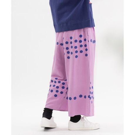角張ったドット柄を、大きなボーダー状に並べたオリジナルパネルプリントで仕立てたパンツ。リネンの節の素材感で、カジュアルかつヴィンテージライクな軽く透け感のある生地を使用しています。フロントワンタックで広がりすぎないワイドな9分丈パンツ。ウエストはゴム仕様で、内紐つき。両サイドポケットつき。