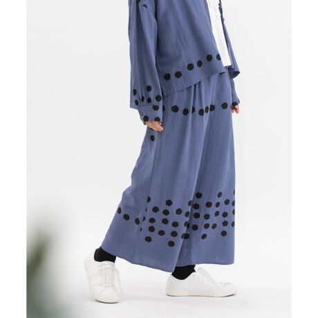 角張ったドット柄を、大きなボーダー状に並べたオリジナルパネルプリントで仕立てたパンツ。リネンの節の素材感で、カジュアルかつヴィンテージライクな軽く透け感のある生地を使用しています。フロントワンタックで広がりすぎないワイドな9分丈パンツ。ウエストはゴム仕様で、内紐つき。両サイドポケットつき。