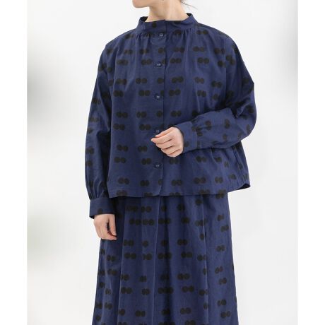 ドットを二つ並べたレトロな雰囲気のオリジナル生地で仕立てたブラウス。ざらっとしたナチュラルな風合いの軽いリネンコットン生地で、少し太めなスタンドカラーの衿ぐりに少しギャザーを入れて優しい印象にしました。前後どちらでも着用を楽しめる2way仕様です。クラシカルな短めの9分袖で、共くるみボタンを使用しています。両サイドにポケットあり。