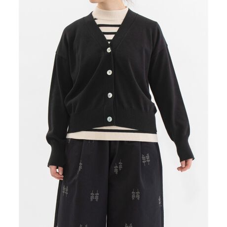 オーガニックコットンを使用したVネックカーディガン。12ゲージの天竺編みで、身巾にゆとりを持たせたショート丈シルエットはバランスよく着こなせます。しっかりと太さのある前立てがデザインのポイント。ポケットは付けず、すっきりとした印象に仕上げました。秋口から春先までロングシーズン活躍するアイテムです。