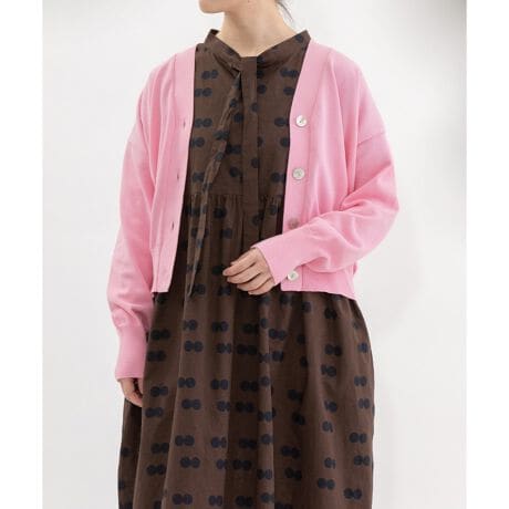 オーガニックコットンを使用したVネックカーディガン。12ゲージの天竺編みで、身巾にゆとりを持たせたショート丈シルエットはバランスよく着こなせます。しっかりと太さのある前立てがデザインのポイント。ポケットは付けず、すっきりとした印象に仕上げました。秋口から春先までロングシーズン活躍するアイテムです。