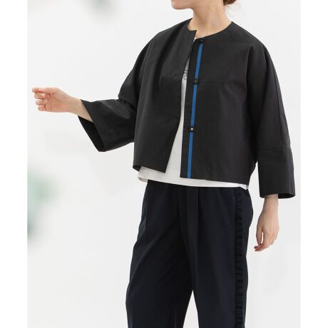 コットンポリエステルツイルの7分袖ドルマンジャケット。裏地を付けない軽やかな仕立てで、縫い代はパイピング始末にしています。ゆったりとしたシルエットながら、ショート丈ですっきりと品よく着られる一枚。袖口はバイヤス仕立てで、折り返してもきれいになじみます。下前には配色グログランテープを施し、さりげないアクセントに。共くるみスナップとダーツ利用のポケットで、上品さと実用性を兼ね備えています。