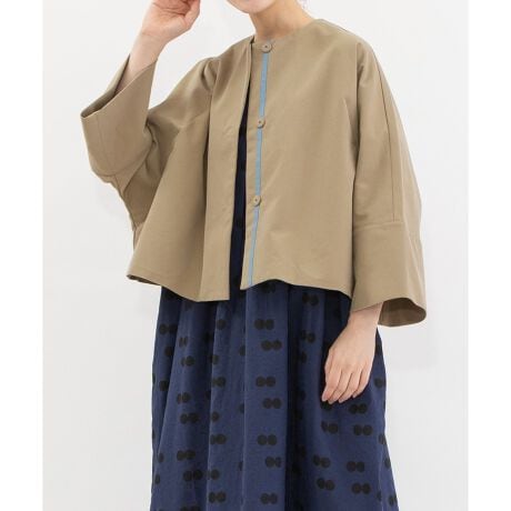 コットンポリエステルツイルの7分袖ドルマンジャケット。裏地を付けない軽やかな仕立てで、縫い代はパイピング始末にしています。ゆったりとしたシルエットながら、ショート丈ですっきりと品よく着られる一枚。袖口はバイヤス仕立てで、折り返してもきれいになじみます。下前には配色グログランテープを施し、さりげないアクセントに。共くるみスナップとダーツ利用のポケットで、上品さと実用性を兼ね備えています。