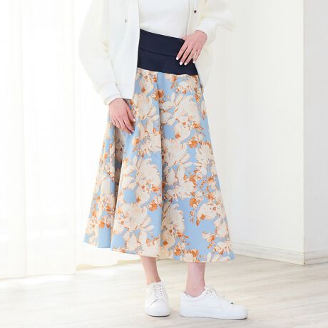 たっぷり分量を取った贅沢なフレアシルエットながらも、品の良い水彩タッチの花柄がエレガントなムードを演出します。