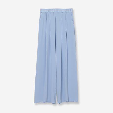 リラクシーで綺麗見えが叶うとろみ素材や楽に履けるウエストゴムのイージーな仕様、タックの入ったワイド型シルエット。