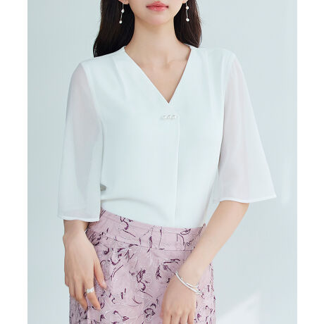 普段使いからオケージョンまで着回せるきれいめなVネックパールブラウス。