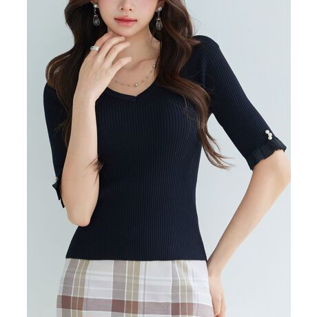 Vネック五分袖ニットプルオーバー