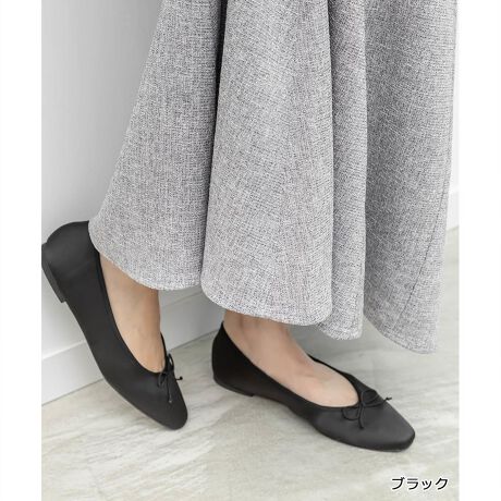 すっきりとしたフォルムとスクエアトゥが上品な足元を演出してくれるフラットパンプス。