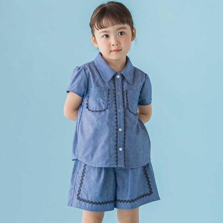山道テープがアクセント。涼しげダンガリーの上品な女の子用セットアップ。