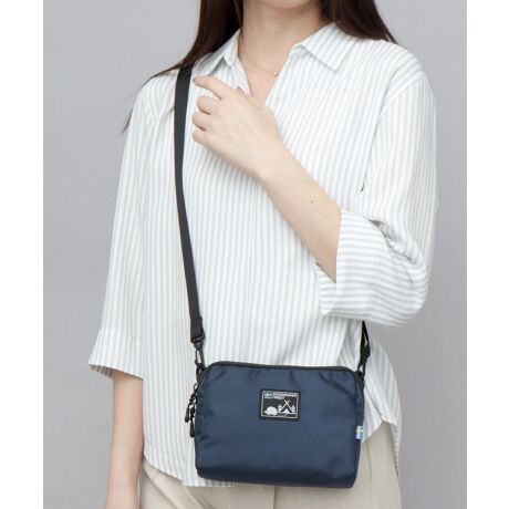 すっきりシンプルなスクエア型のミニショルダーバッグ。フロントに配置した、キャンプをしているハリネズミのブランドタグと、スウェーデン国旗のピスネームが目を惹くアクセントに。