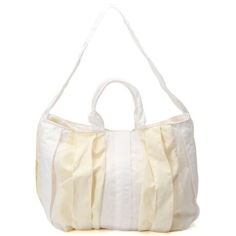 [型番:E8028]シワ感のあるナイロンツイルとコットンライクなポリエステル素材を使った2WAYトート。プリーツ仕立ての本体がポイントで、異素材を交互に繋ぎ合わせることで、質感の違いによるストライプを表現しています。両サイドの内ポケットには折りたたみ傘やウォーターボトルなどを固定する為のベルクロを付けました。・内ポケ・・・5つ