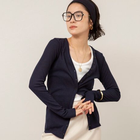 ・しなやかなリブ素材が、身体にほどよく沿いながら、すっきりとした印象をつくるカーディガン