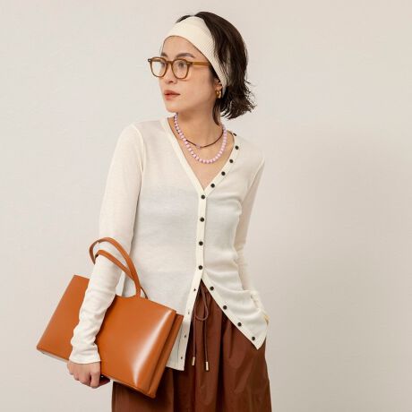 ・Vネックのラインがデコルテをきれいに見せ、前を留めても、さっと羽織っても着用可能
