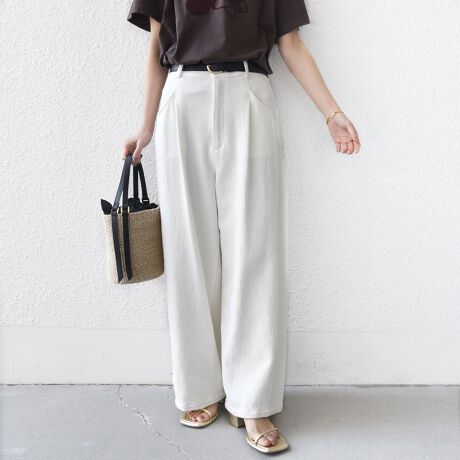 ワイドなシルエットですが縦にすっきり、脚長に見せる効果があります。