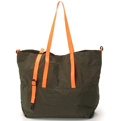 [型番:E8036]軽量なナイロンリップストップ素材を使用したパッカブルトート。内ポケットは背面に本体を収納、前面には必要最低限の小物を入れられる2ポケット構造で、本体収納時はストラップを付け替えてショルダーポーチとして使用できます。また、トートバッグ本体は肩掛け可能なハンドル付きで、同じストラップを取り付ければショルダーバッグとしても使えます。★収納ポーチのサイズ:22x18x4(cm)