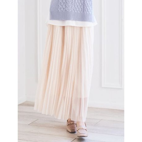 [型番:26550730243]煌びやかなジルコンが散りばめられたロングスカート。プリーツ加工を施すことで、動くたびに自然な揺らめきを演出します。フィット感のあるウエストゴム仕様がポイント。休日のお出かけやちょっとしたお呼ばれシーンにも活躍するアイテムです。モデル(ベージュ着用)身長:165cmMサイズ着用