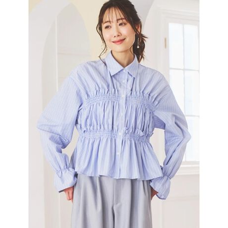 [型番:26560778615]くしゅっとしたシャーリングが表情感を演出するシャツ。短めのショート丈のデザインがウエストラインをすっきりと見せてくれます。カラーによって異なる柄展開にも注目。パンツやミニ丈のスカートと合わせたトレンドライクなコーディネートがおすすめです。モデル(B柄/白着用)身長:165cmMサイズ着用