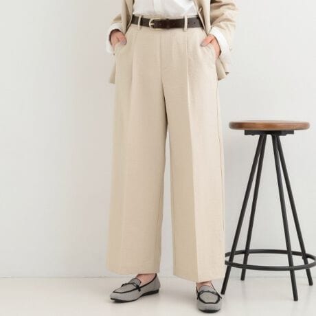 まっすぐなシルエットが脚のラインをきれいに見せてくれて、タックが入っているので穿きやすく、スタイリッシュな印象のワイドパンツ。