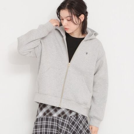 後ろ裾にタックを入れた丸みのあるフォルムと、大きめフードが可愛いポイント。