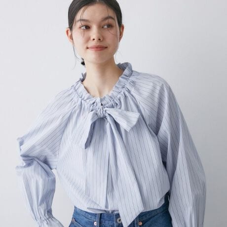 繊細なフリルディテールと、存在感のあるボウタイが目を惹くストライプ柄ブラウス。