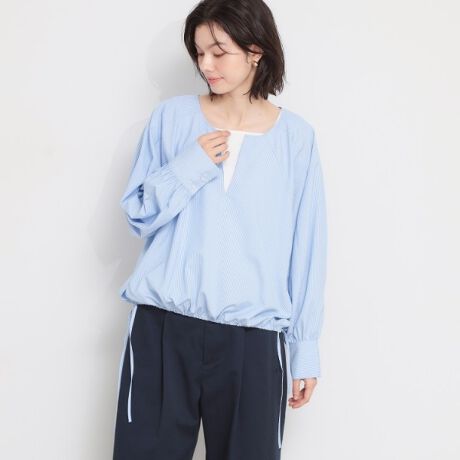 キーネックで抜け感を出しつつ、きれい見えするストライプのシャツブラウス。
