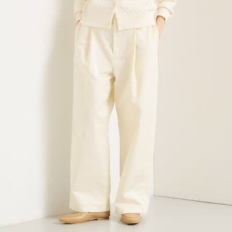 ややハイウエストに、ベルトライン直下の深いタックでウエスト周りに表情をプラス。