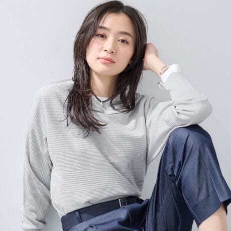 ハイゲージでありながら表情感のある編地で、袖は編み続きでできる一番キレイなボリューム感を出し、裾は優しくラウンドさせているのでさらっと着るだけで女性らしいシルエットにしています。
