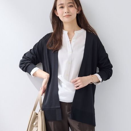 ストンと真っすぐに落ちた衿ラインが上品な印象のシンプルな着流しカーディガン。