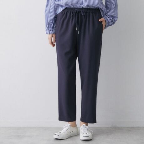 ウエストは総ゴム+ドローストリング仕様で、きれいめな見た目とイージーな穿き心地を両立。