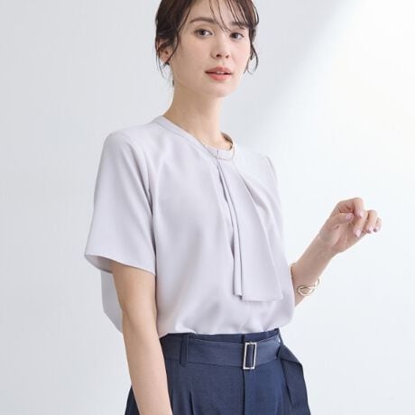 胸元にボウタイ風のアクセントを効かせた、エレガントな半袖ブラウスです。