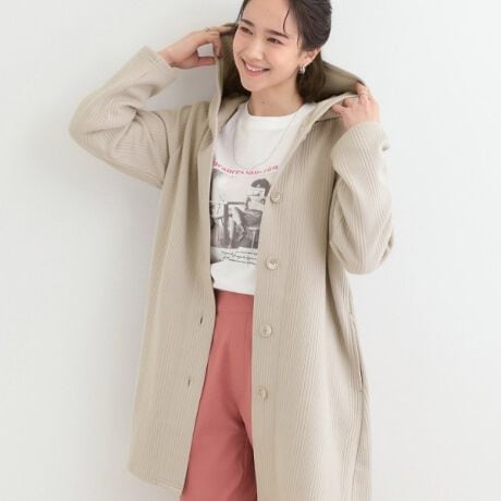 フード付きでカジュアル感がありながら、シックなカラーリングと上品なボタンデザインが洗練された印象を与えています。