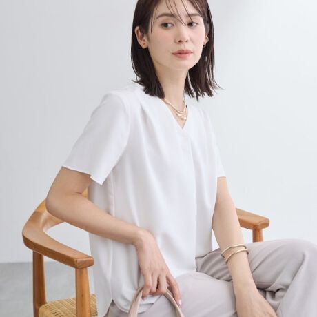 シンプルな中に洗練された印象を与えるVネックブラウス。