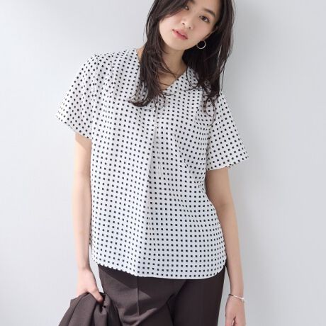 胸元のタックデザインが立体感を生み出し、顔周りをすっきりと見せます。