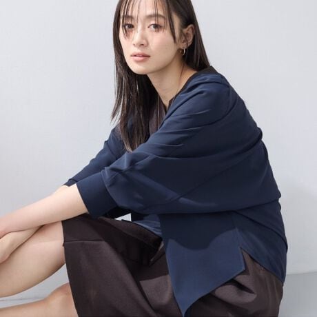 パンツ・スカート問わずご着用いただける着丈設定となっているので、アウトスタイルはもちろん、前だけハーフインしていただくことでこなれ感のあるスタイリングでご着用いただけます。