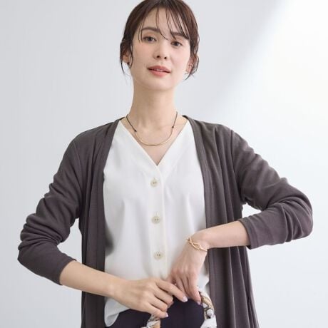 コンパクトなサイジングでお仕事シーンや冷房対策にも活躍するベーシックな着流しカーディガンです。