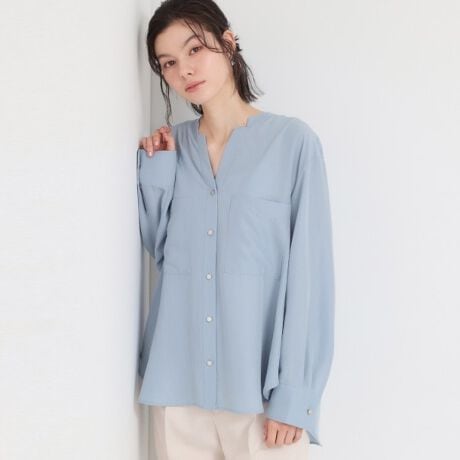 刻みネックが生むすっきりとしたネックラインが上品なシャツ。