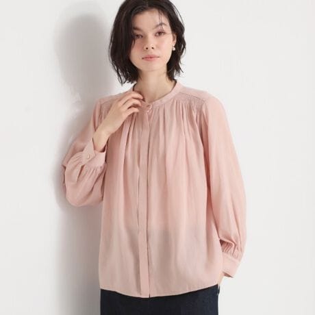 衿元にはタック、肩には細かなシャーリングを施し、シンプルながら表情のある一枚に。