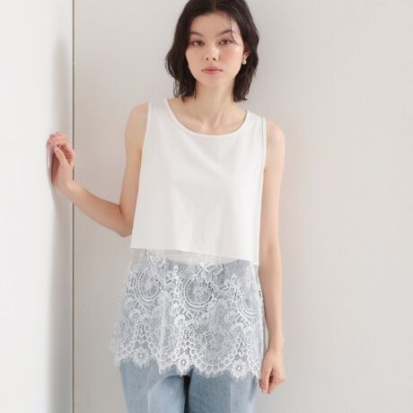 カットソーボディに可憐なレース裾をドッキングしたタンクトップ。