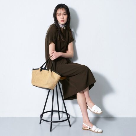 首元はスキッパーデザインですっきりと見せ、前中心の縦の深めなタックがスタイルアップ見えするワンピースとなっています。