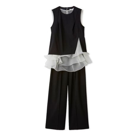 マットオーガンジーのフリルトップスに、布帛素材のブラウスとストレートパンツの3点セットアップ。
