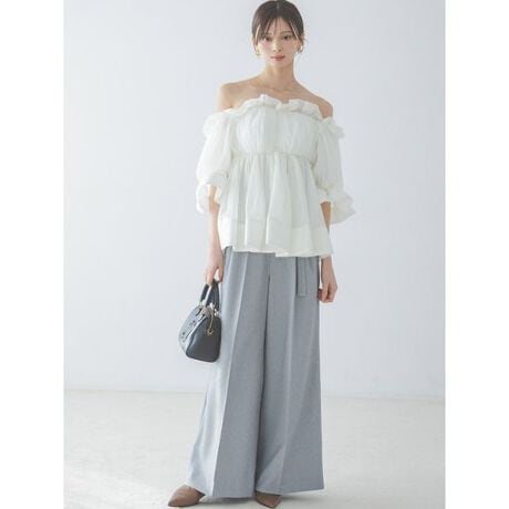 ほどよい落ち感がありながらも、インナーが響かないしっかりとした生地感。動くたびに上品に揺れる素材で、シルエットを美しくキープします。カラーはオフホワイト、グレー、ブルーの3色展開。季節を問わず活躍する万能アイテムです。