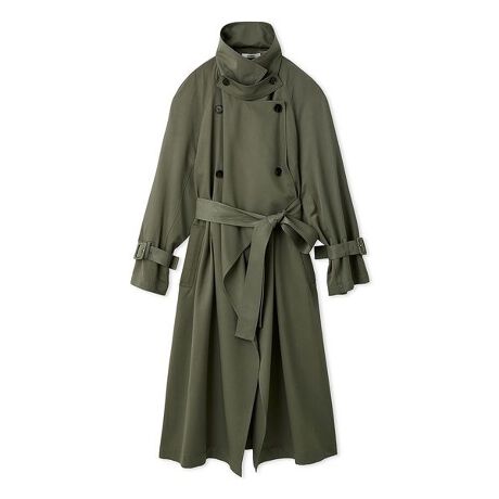 毎年人気のロングトレンチコートをアップデート。クラシカルなトレンチコートをベースに少し大きめな襟で顔周りを華やかに。抜け感のあるヘムラインで軽やかに着こなしていただけるデザインです。スタンドカラーにもアレンジいただけます。アームベルト付きで、キュッと絞ってご着用もいただけます。共布の大判ストールがセット。首元でくるっと巻いていただくアレンジのほかにも、サイドのボタンを首元で留め、着流してご着用いただけます。長めのウエストベルトも付いていて、後ろで結んだり、フロントサイドで結ぶアレンジが可能です。