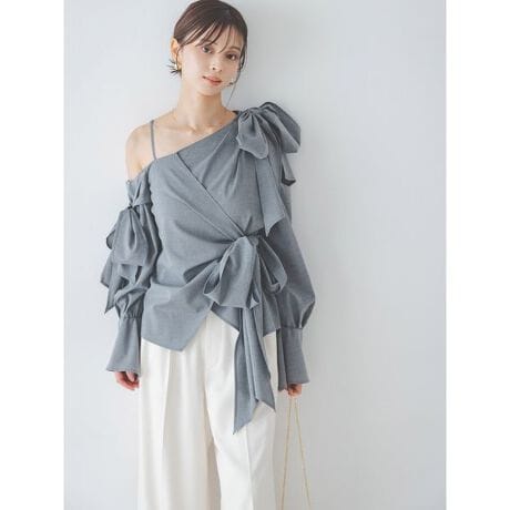 肩上や袖、カシュクール風のウエスト位置に存在感のあるふんわりリボンディテールを取り入れた、トレンド感のあるワンショルデザインのブラウスです。