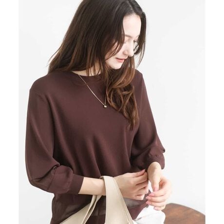 裾と袖口に同色のシアー素材で切替えを入れ軽さを出したニット。シンプルなのに洒落見えするデザインでコーディネートのポイントにも着映える一枚です。