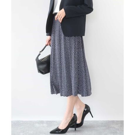 上品で落ち着いた細やかな幾何柄プリントの膝下丈タックスカート。とろみのある素材はタックが広がらずにすっきりときれいめに着こなせます。定番人気のアイテムですが、今回はいつもよりタックの本数を増やし、入り方を変えた新しいデザインにアップデート。