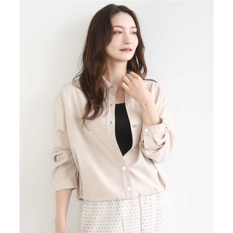 短めの丈感で、どんなボトムにも合わせやすく、羽織りとしても着こなせる便利なシャツブラウス。裾のドロストを絞ってふんわりさせた着こなしもおすすめです。