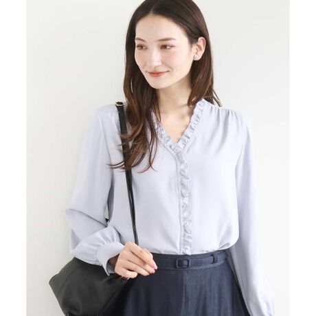 シャープなVネックに小さなフリルをあしらうことで甘くなりすぎないクールフェミニンな印象のブラウス。