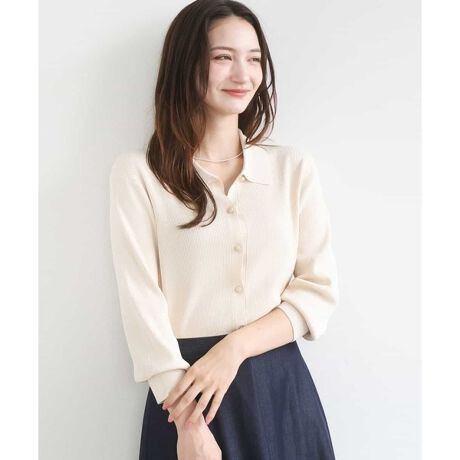 コンパクトな衿付きニット。前釦タイプですが、一枚着として前を閉じてプルオーバー感覚での着こなしがおすすめ。