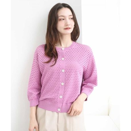インナーのカラーレイヤードも楽しめる、ドット風のアイレット編地のニットトップス。ボディラインを拾いにくい適度な肉感で、どちらを前にしても着こなせる前後2wayデザインです。前立ての大きめな白釦がアクセントに。
